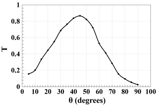 To realize the pursued logic gates with high CRs, the angle between the slots (i.e., θ) is crucial for the proposed design. As a result, Figure 3 simulates the impact of this parameter on the normalized spectral transmission (T) at a 1.55 μm operating wavelength. From this figure, it can be observed that the highest T occurs at θ = 45°, which therefore is the optimum value chosen for θ throughout our simulations. By elaborating on this figure, it can also be seen that by increasing or decreasing the value of θ, the light scattering and absorption inside the materials are increased, which in turn leads to higher losses.