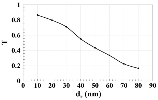 The simulated spectral transmission (T) as a function of the distance between the slots and microring (dr) at 1.55 μm is shown in Figure 4. This figure shows that the Ψ-shaped silicon waveguide achieves a high T = 0.552 up to dr = 40 nm. At dr = 0, the proposed waveguide achieves T = 0.762, which is lower than the T = 0.865 achieved at dr = 10, due to the scattering at the interfaces between the slots and the microring. This indicates that the practical realization of the proposed design should be feasible, especially with the availability of the 3D capability of the femtosecond laser direct writing (FLDW) technology [42,43,44,45,46,47,48].