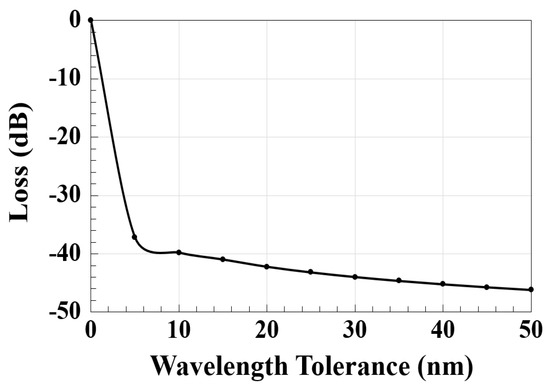 The manufacturing tolerances concern the control of the geometrical dimensions during processing and their impact on the functionality of the device. The operating tolerances, on the other hand, concern how the device reacts to changes in the wavelength, polarization, temperature, input field distribution, and refractive index [49,50]. The actual wavelength of a 1550 nm fiber laser may vary as 1550 nm ± 20 nm due to a wavelength tolerance of ± 20 nm [51]. The dependence of the optical loss on the wavelength tolerance using the proposed waveguide and Equations (4)–(7) from Ref. [52] is shown in Figure 5.