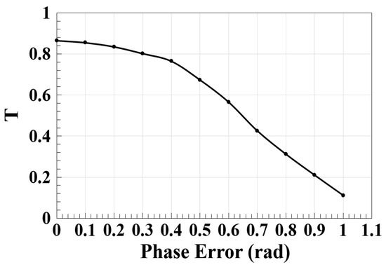 A larger device area, apart from raising costs, also results in more insertion loss, which necessitates applying and satisfying strict requirements for the thickness and width of waveguides across the wafer in order to prevent crosstalk, which typically reduces the platforms’ performance [53]. Additionally, the variations in the process, such as those in the waveguide thickness, etching depth, waveguide width, and material refractive indices, lead to phase errors that induce uncertainty into the responses of photonic devices [54,55,56]. Therefore, it is essential to study how the phase error affects the performance of the logic operations. The dependence of the normalized spectral transmission (T) on the phase error utilizing the Ψ-shaped silicon waveguide at 1.55 μm is depicted in Figure 6. This figure demonstrates how T is decreased as the phase error is increased, which in turn leads to a reduction in the CR.