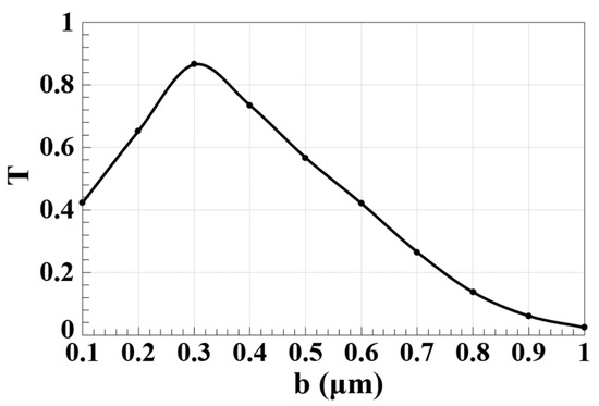 We examined the design performance using various microring sizes to produce more realistic results. Therefore, in order to prevent accidental crosstalk and achieve high CRs for the considered operations, we optimized the microring outer radius (b). Figure 7 shows the dependence of T on b using the proposed waveguide at 1.55 μm. This figure clearly shows that the maximum T occurs at b = 0.3 μm, which justifies selecting this value as the optimum for b throughout the simulations. It becomes clear that as b is changed, the light scattering and materials absorption are likewise affected, which causes higher losses.