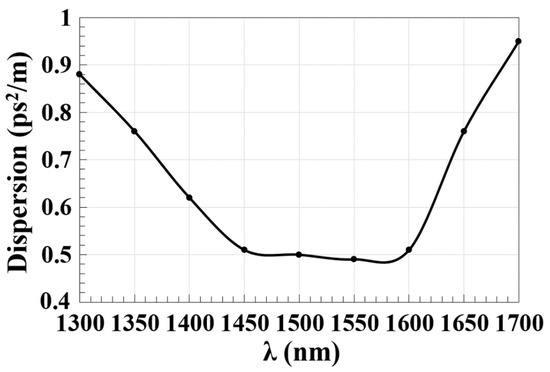 Dispersion flattening has proven to be a challenging issue to address in silicon waveguides due to the excessive waveguide dispersion and constrained light confinement in the highly nonlinear integrated waveguides. Phase mismatching can be reduced and, accordingly, the need for substantial pump power in nonlinear processes can be eliminated by improving the dispersion profile of silicon waveguides [57]. Waveguide dispersion is reduced, as seen in Figure 8, by decreasing the operating wavelength (λ). The Ψ-shaped silicon waveguide exhibits flattened dispersion from 1.45 to 1.60 μm and achieves a low dispersion of 0.49 ps2/m at 1.55 μm, which may be helpful for both telecom and mid-infrared applications. It is possible to control waveguide dispersion and enhance the performance of the device by modifying the waveguide’s geometry [58].