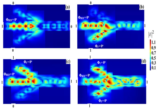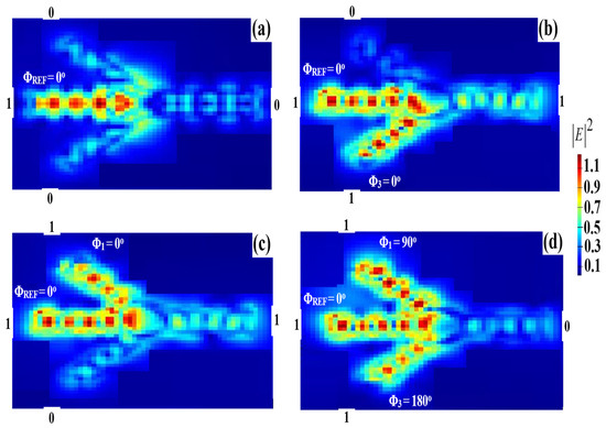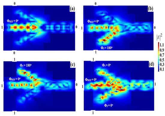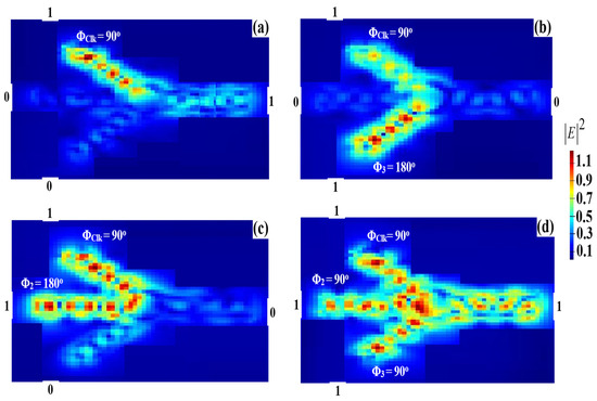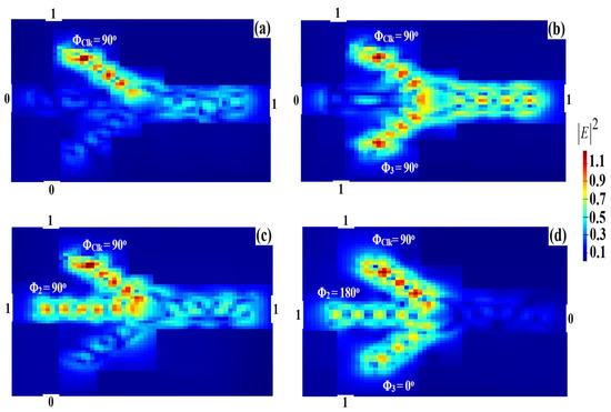For the XOR operation, two input beams are injected into ports 1 and 3, respectively, while a REF is injected into port 2 in Figure 1. Constructive interference occurs when all the input beams are launched with the same phase, whereas destructive interference occurs when these beams exhibit a different phase. Therefore, when the combination (01, 10) is launched along with the REF at the same phase, i.e., Φ1 = Φ3 = ΦREF = 0°, port 4 produces a ‘1’ output due to the constructive interference between the input beams. When both input beams are ‘1’, i.e., ‘11’, and are fed into the waveguide along with the REF beam at different phases, i.e., Φ1 = 90°, Φ3 = 180°, and ΦREF = 0°, all the injection beams interfere destructively, resulting in T < Tth or equivalently in, i.e., ‘0’ output. The XOR logical outcome is achieved in this way. Figure 9 displays the XOR field intensity distributions when using the Ψ-shaped silicon waveguide at 1.55 μm.