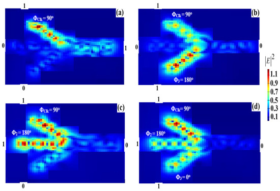For the XNOR operation, the Clk is injected to the configuration shown in Figure 1 from port 1 with ΦClk = 90°, whereas the other two beams are injected from ports 2 and 3, respectively. When the combination (11) enters together with the Clk at the same phase of 90°, port 4 produces ‘1’s as the output as a result of the concomitant constructive interference. When the combination (01) or (10) is launched with various relative phases, port 4 produces ‘0’s as the output. Figure 15 displays the XNOR field intensity distributions when using the proposed waveguide at 1.55 μm.