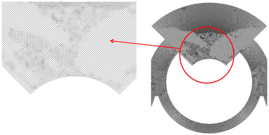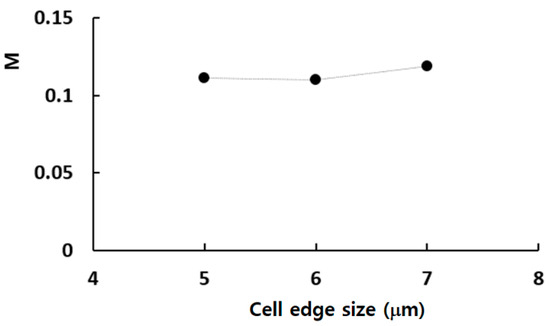 The micromixer shown in Figure 1 was meshed using a sufficient number of cells. The edge size of each cell was determined through a set of preliminary simulations. To do this, the edge size was varied from 5 μm to 7 μm, corresponding to cell numbers ranging from 4.43 × 106 to 11.5 × 106. The simulations for this grid independence were conducted at a Reynolds number of Re = 10. Figure 2 presents an enlarged view of the grid within a mixing unit for a closer inspection. To enhance reliability in numerical results, hexahedral cells were predominantly employed in the present simulations. Figure 3 illustrates the grid independence of numerical solution. Here, M stands for the mixing index defined by Xia et al. [54] in the following way: