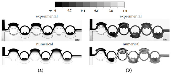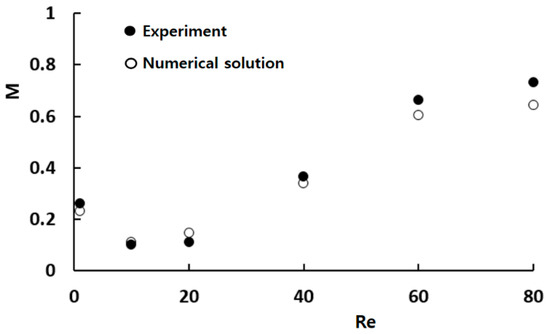 Figure 4 presents a quantitative comparison between the numerical results and the corresponding experimental data by Xia et al. [54]. Despite some discrepancies between the numerical solution and experimental data in Figure 4, a similar trend was demonstrated with respect to the Reynolds number. The observed discrepancy could be ascribed to several factors, including numerical diffusion inherent in the simulation and experimental uncertainties inherent in experimental measurement. Figure 5 presents a comparison between the numerical concentration contours and the experimental confocal images at Reynolds numbers of Re = 1, and Re = 80. The simulated concentration contours show good agreement with the corresponding experimental images, irrespective of Reynolds number. Specifically, the mixing pattern due to the vortex motion within the mixing units is also predicted reliably at the Reynolds number of Re = 80.