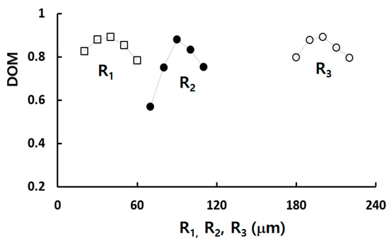 Figure 9 demonstrates how the optimal values of R1, R2, and R3 affect the DOM at Re = 0.5. It confirms that the design values listed in Table 3 are properly optimized for the DOM. The figure also affirms that R2 is most influential parameter as the DOM shows the greatest dependence on R2. As seen in Figure 8, both R2 and R3 were selected at the peak value of the normalized DOM, resulting in the highest DOM at R2 = 90 μm and R3 = 200 μm, respectively. In contrast, R1 was chosen at the highest value of the normalized DOM in Figure 8, with the optimum value being R1 = 40 μm in Figure 9. Nevertheless, its effect on the DOM is relatively limited.