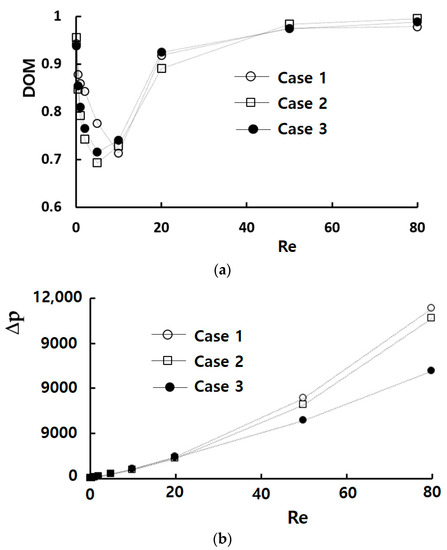 Comparison of three optimum designs: (a) DOM vs. Re, and (b) ∆p vs. Re.