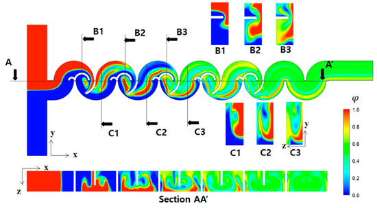 Figure 11 illustrates the mixing process of Case 1 in terms of concentration contours at various cross sections at a Reynolds number of . The cross sections, B1, B2, B3, C1, C2, and C3, were obtained cutting the micromixer in the x-direction as indicated. Similarly, the plane AA′ is in the y-direction. The concentration contours on the xy plane unveil a vigorous mixing process taking place after the fluid traverses the second baffle within each mixing unit, leading to the envelopment of fluid “A” by fluid “B”. Upon closer examination of the concentration contours at the B1, B2, and B3 cross sections, it becomes evident that the submerged circular baffles operate as a contraction-and-expansion mixing device. This configuration effectively enhances mixing, as shown in previous research [59]. On the other hand, the concentration contours at C1, C2, and C3 cross sections demonstrate that a distinct mixing process occurring within the open space between the lower and upper mixing cells is achieved differently. This mixing enhancement is caused by the flow following the circular wall of the micromixer, with the walls facing opposite each other. In Figure 12, the mixing enhancement is further elucidated through streamlines. Upon entering the first mixing cell, streamlines originating from the both inlets initially travel separately in the z-direction. However, a convergence of streamlines is observed from the second mixing unit onwards, facilitated by the flow adhering to the circular walls. This unique flow pattern is an additional mechanism contributing to the mixing enhancement in the low Reynolds number regime ( < 10). This phenomenon is visually apparent through the multiple fluid interfaces captured within the open space in Figure 11. In the open space connecting the lower mixing cell and the upper mixing cell, the concentration contours in Figure 11 show several elongated interfaces.