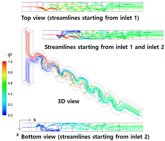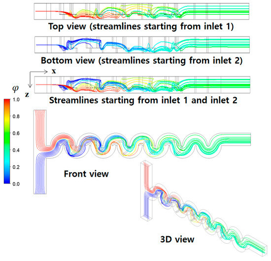 Development of streamlines starting from two inlets along the micromixer for R1 = 30 μm, R2 = 90 μm, and R3 = 200 μm at Re = 0.5.