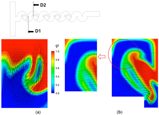 Vortex pattern and concentration contours at Re = 20 for R1 = 30 μm, R2 = 90 μm, and R3 = 200 μm at Re = 20: (a) at D1 and (b) at D2.