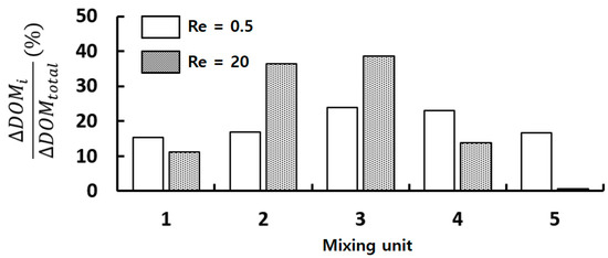 Figure 16 provides a comprehensive comparison of the mixing contribution by each individual mixing unit within the micromixer, as a percentage of the overall DOM of the micromixer. At Re = 0.5, each mixing units contributes a similar amount across all five mixing units. This even contribution suggests that the set of three circular baffles effectively functions as a beneficial mixing device in the low Reynolds number regime ( < 10). Conversely, at Re = 20, the contributions of the second and third mixing units are notably greater than those from the remaining mixing units. Intriguingly, the fifth mixing unit makes a negligible contribution to the overall mixing. This implies that the set number of baffles should be considered in the optimization of a micromixer operating across a wide Reynolds number range.
