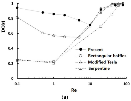 Figure 10 compares the mixing performance of the three optimized designs. Case 1 shows the best DOM performance when the Reynolds number is approximately less than 10. For example, the DOM of Case 1 is increased 8% from that of Case 3 for Re = 5. On the other hand, Case 3 requires the minimum pressure drop when the Reynolds number is larger than 20. For instance, the require pressure drop of Case 3 is 58% reduced from that of Case 1 for Re = 80, even though Case 3 presents a slightly higher DOM. A noteworthy observation is that the DOM in the range of < 10 is highly responsive to the optimized geometric parameter values. Consequently, Case 1 optimized for the molecular dominance mixing regime emerges as a preferable choice when designing a passive micromixer operating over a wide range of the Reynolds number.