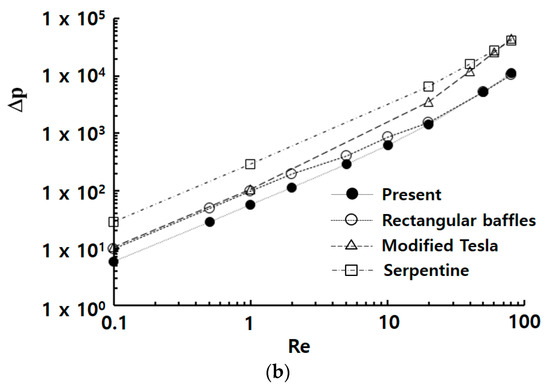 Comparison of the mixing performance of present micromixer with other passive micromixers: (a) DOM vs. Re, and (b) ∆p vs. Re.