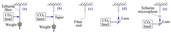 We manufactured microspheres from tellurite filaments (coreless fibers) drawn from a melt of high-purity tellurite glass. We used an original technology for tellurite glass synthesis described, for example, in [25,26]. To form a solid microsphere at the end of the filament, we carried out the process schematically presented in Figure 1. The glass filament was softened and melted with a CO2 laser. This process has been described in detail in [16,26]; here, we briefly consider the main steps. First, the filament was vertically suspended with a weight at its end (Figure 1a). Second, a taper was formed by softening the filament with CO2 laser pulses (Figure 1b), and then it was split into two parts (Figure 1c). Next, a solid glass microsphere was formed at the tapered end under the action of CO2-pulsed radiation due to the surface tension force (Figure 1d,e). The size of the microspheres was controlled in the 40–100 µm range by the number of laser pulses and their energy [16].
