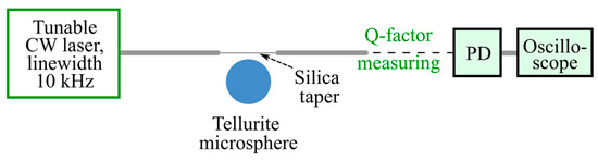 For measuring the Q-factors of the produced tellurite glass microspheres, we used a well-known dynamic method of analyzing resonant WGM dips by scanning them with a tunable narrow-line CW laser and recording them with an oscilloscope (Figure 2). The parameters were the following: scanning rate 10 GHz/s, scanning range 70 GHz, and central frequency f0 near 194 THz. To operate in a linear regime and avoid nonlinear effects leading to distortions in resonance line shapes, the pump power was decreased to 100–200 nW. The Q-factors were calculated as Q = f0/δf, where δf is the linewidth (at 1/2 level).