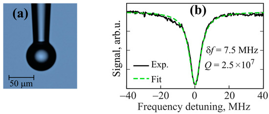 We manufactured a set of tellurite microspheres with diameters in the 40–100 µm range. An image of a 60 µm tellurite glass microsphere obtained with an optical microscope is demonstrated in Figure 3a. Its measured and Lorentz-fitted resonance curves are plotted in Figure 3b. The resonance dip has a width of δf = 7.5 MHz at a central frequency of about 194 THz corresponding to the loaded Q-factor Q = 2.5 × 107. Note that for the produced samples, the loaded Q-factors were similar (~2–2.5 × 107) and almost independent of the diameter.