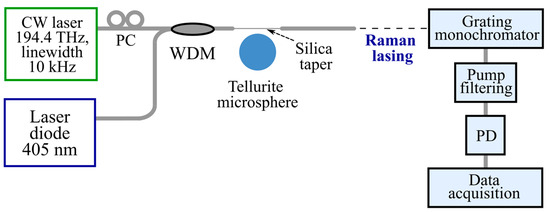 To demonstrate experimentally this idea of thermo-optical on/off switching of Raman lasing, a testbed was assembled (a simplified scheme is shown in Figure 4). We used a pump laser at a fixed frequency f0 = 194.4 THz to generate a Raman wave shifted by 27.5 THz. A polarization controller was used to adjust the optimal polarization of the pump wave. The pump wave was combined with the help of a wavelength division multiplexor (WDM) with the light of a violet-blue diode and was then launched into a 60 µm microsphere through a silica taper. Tellurite glass is nontransparent at a wavelength of about 400 nm (the measured transmission is almost zero [25]). Therefore, the auxiliary diode radiation (with a maximum output power of 2 mW before the fiber taper) was well absorbed in the microsphere near the equator. A Raman wave pumped at 194.4 THz could be generated if the frequency of some eigenmode was tuned to the pump frequency, and this mode was pulled. Note here that the WGM frequency should be tuned to the pump from a lower to a higher value to achieve mode pulling (similar to the conventional method of pump frequency scanning from a higher to a lower value). To record spectra of Raman lasing near 1.8 µm, we used a grating monochromator and a polycrystalline lead sulfide (PbSe) photodetector. The residual pump light was blocked by a filter to avoid photodetector damage.