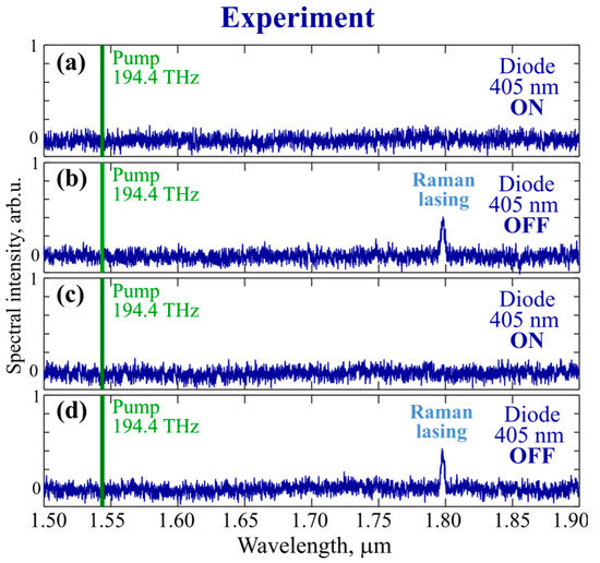At the beginning of the experiment, we switched on the 194.4 THz pump laser at a power of 8 mW, which worked stably in the same mode during all subsequent actions described below. When the pump laser was switched on at a constant frequency, no lasing was observed since its frequency was far from the hot frequency of any high-Q WGM. Then, we switched on the violet-blue diode. The estimated thermalized power was about 1 mW at a thermal steady state (violet-blue light partially passed through the taper). Due to the thermalization of its power, the eigenmode frequencies shifted to the long-wavelength spectral region, and Raman generation, as expected, did not occur (Figure 5a) since the dynamical tuning of the eigenfrequencies was from higher to lower values.