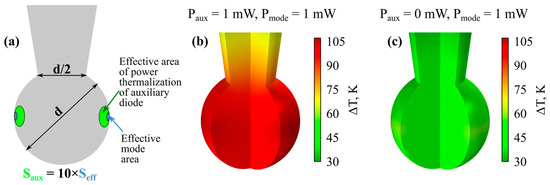 To theoretically support the experimentally observed thermo-optical processes, we performed numerical FEM simulations using a realistic model. The used geometry is shown in Figure 6a. A boundary condition of natural convection in air was used on all surfaces. We assumed that partial thermalization of the power of a single-mode pump laser occurs in the volume corresponding to the effective volume of an unperturbed fundamental eigenmode with effective area Seff (Seff ≈ Veff/(πd)), and thermalization of the power of an auxiliary violet-blue multimode diode occurs in a region with a larger area Saux. We verified that Saux can be varied over a wide range without significantly affecting temperature fields (for the same thermalized power). In the simulations presented below, we set Saux = Seff × 10. An example of the temperature distribution when the thermalized powers of the pump laser and the auxiliary diode are equal to 1 mW in a 60 µm microsphere is shown in Figure 6b. This case qualitatively corresponds to the experimental situation when both the pump laser and the violet-blue diode are switched on (Figure 5a,c). The temperature distribution when the violet-blue diode is switched off and only the pump laser operates is shown in Figure 6c. This case qualitatively corresponds to the experimental situation in Figure 5b,d. Numerical FEM simulations of nonstationary thermal problems show that, for a 60 μm microsphere, the characteristic thermal relaxation time for the switching process is about 20 ms.