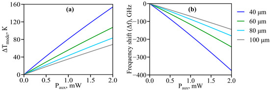 Next, we simulated the frequency shift in eigenmodes as a function of the thermalized power of auxiliary diode Paux for microspheres of different sizes. The results are presented in Figure 7b. It is seen that even low diode powers of the order of a few hundred µW provide a sufficiently high thermal tuning range for eigenfrequencies, which is sufficient for thermo-optical on/off switching of nonlinear effects due to mode pulling as was demonstrated in our experiment. The smaller the microsphere, the stronger the thermal effects. Moreover, we verified that Saux can be varied in a wide range without significant impact on thermal WGM shifts. For example, the maximum thermal shift changes only by 0.7% for Saux = Seff × 50 (compared with the cases considered above for Saux = Seff × 10).