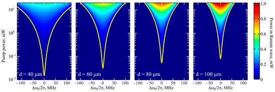 We also theoretically studied Raman lasing in the framework of the model described by the system of Equations (1) and (2). The parameters used in the calculations are given in Table 1. Since, in our experiments, the Q-factors practically did not depend on the size of the microspheres, we also took a constant value in the calculations. The calculated powers in the Raman wave depending on the detuning and the pump power for various microsphere diameters are demonstrated in Figure 8. The yellow lines indicate the Raman lasing thresholds obtained with the expression (3). From this expression, it can be readily found that for the same detuning, the threshold pump powers are proportional to the effective mode volume: