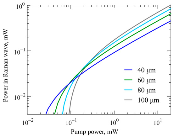 We also note the interesting and not obvious fact that the maximum power in the Raman wave is achieved for large microspheres at a pump power of the order of 1 mW and higher, but the detuning should be sufficiently small (Figure 8). For more clarity, we plotted the dependences of the power in the Raman wave on the pump power at zero detuning, i.e., at exact resonance (Figure 9). It is seen that, although the thresholds for small microspheres are reached first, the Raman wave power grows faster for large microspheres at low pump powers. At a pump power of about 100–200 µW, the output powers are quite close; starting from these values, the larger the microsphere diameter, the greater the power in the Raman wave.