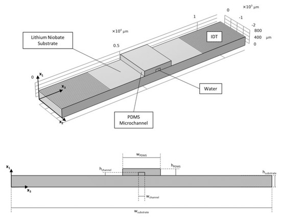 The same PDMS boundary conditions applied by Ni et al. in [45] have been adopted in the presented model. The top lids of microchannels are typically several millimeters in thickness; therefore, the reflected waves from the top surface of the microchannel lid can be neglected due to wave attenuation. To model that effect, the PDMS upper surface is assigned to be low-reflective. In this way, the thickness of the lid can be reduced in the model, and the computational performance is improved. Both the lateral surfaces of the microchannel structure are set as traction free.