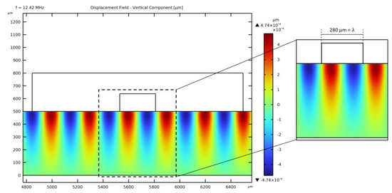 As lithium niobate is an anisotropic material, the specific velocity of waves traveling in the direction perpendicular to the longitudinal axis of the channel has been considered. A frequency domain analysis has been performed by varying between 12 MHz and 13 MHz to account for the effects of anisotropy on and find the correct actuation frequency for the model geometry. The selected frequency, as obtained from the analysis, is = 12.42 MHz, as also induced by the constructive interference between the opposite TSAWs. In Figure 2, the SSAW in the region of the microchannel is plotted. The wavelength λSAW is assured to be around 280 μm as it fits the width of the fluid domain. The wavelength of the SSAW is the same as that of the traveling waves since they are both actuated at the same frequency , and the sources are placed an integer multiple of λSAW away from each other.