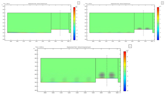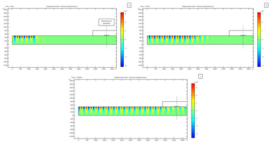 Having defined the actuation frequency, time domain analyses have been run with the voltage applied to the electrodes harmonically varying in time between −8 V and 8 V. The generation through the inverse piezoelectric effect and the following propagation of the TSAW at the lithium niobate surface at three different instants after the beginning of actuation are shown in Figure 3. As soon as the IDTs are actuated, the surface waves are triggered below the electrodes (Figure 3a) and then travel across the device cross-section (Figure 3b) to finally meet with the other counter-propagating TSAW (Figure 3c), leading to the reported SSAW solution around the channel. The plots show that the Rayleigh wave is characterized by the largest (vertical) displacements at the top free surface of the substrate; moving downwards, the wave is reduced in amplitude till vanishing at a distance ≅ 1.5 = 320 μm away from the surface, where only 10% of the maximum wave amplitude survives. As far as the design of the entire device is concerned, the adopted thickness of the piezoelectric substrate needs to be larger than this distance to ensure that possible negative interference effects are not generated by the boundary conditions at the bottom surface of the substrate itself. To completely avoid the interference of reflected waves from the bottom surface of the substrate, low-reflecting boundary conditions have been applied.