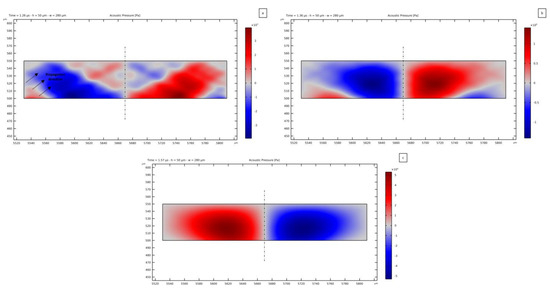 As a result of the analysis, the transmission of the TSAWs to the fluid in the microchannel is computed. In Figure 5, the leaky SAW phenomenon is shown for three successive time steps of the standing acoustic wave generation. The Rayleigh angle of propagation of the pressure waves inside the fluid can be seen, highlighted by arrows in Figure 5a. The magnitude of the pressure field is initially 0.18 Pa at the activation of the voltage signal input, which is very low with respect to the expected value on the order of 104 Pa for a standing pressure wave. This value increases due to the transmission of an SSAW generated by the constructive interference of the two counter-propagating waves (Figure 5b), and the pressure field in the fluid domain then reaches the expected amplitude after 1.57 μs (Figure 5c) the beginning of actuation. The pressure amplitude can obviously be increased by increasing the value of the voltage applied to the IDTs. From Figure 5 it is clear that the acoustic pressure wave is generated in the fluid as a combination of the vertical motion due to the SAWs and their horizontal propagation. Therefore, the transmission of the waves results tilted with respect to the vertical direction, becoming vertical with the development of the SSAW at the end of the interaction between the two opposite TSAWs (see Figure 5c).