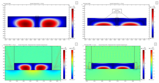 Standing acoustic pressure fields relevant to: (a) 50 µm thick domain, featuring a regular pressure distribution; (b) 35 µm thick domain, with secondary waves in the PDMS causing an anomalous distribution of nodes and antinodes. Plot of the horizontal component of the PDMS displacement together with the resulting standing pressure field: (c) 50 µm thick domain; (d) 35 µm thick domain.