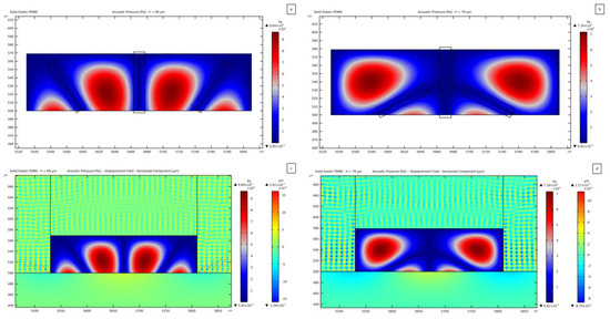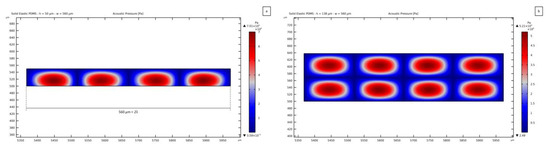 The figures in this section and the following ones report the acoustic pressure field within the fluid domain contained in the microchannel. The reference frame is different in each figure in order to fit the whole domain into the frame itself and highlight details of the solutions. Regarding the geometry of the channel, in this sub-section, the only dimension that is modified is the thickness of the fluid domain, keeping the width fixed to . In the next sub-section, different widths are considered for only two values of thickness: 50 μm and 138 μm.