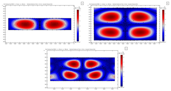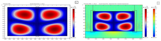 Figure 14b reports the acoustic pressure in the case of a channel 138 μm thick and 280 μm wide. Also in this case, the acoustic pressure distribution is similar to the already discussed one, with one vertical node, one horizontal node, and four antinodes. By comparing this solution with the one reported in Figure 13b, it can be seen that the horizontal node seems to be flatter in the present solution of Figure 14b. Anyway, the motion of the microparticles turns out to be the same as the one reported in Figure 13b.