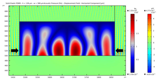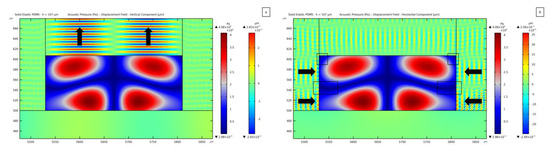 The most severe anomaly in the present investigation is obtained for a channel thickness of 107 μm, see Figure 9. To explain such a distortion of the pressure field, the vertical (Figure 9a) and horizontal (Figure 9b) components of the displacement field in the PDMS structure are reported. Looking at these plots, longitudinal waves inside the solid PDMS can be detected. Figure 9a shows that the vertical component of these waves moves in the vertical direction, from the substrate surface towards the top lid of the microchannel; the black arrows in the figure provide an indication of the direction of motion of the waves in the PDMS to transmit the pressure wave within the fluid. This result is totally predictable. The principle of SAW-based devices is to exploit the propagation of surface waves to induce a specific response in the system. A similar behavior can be seen in Figure 9b, regarding the horizontal component of the displacement field. Such secondary waves (as originated from the PDMS and not from the substrate surface) lead to the transmission of pressure waves to the fluid from sources different from the SSAW. The synergic presence of these two motions in the PDMS generates a standing pressure wave field unexpectedly distorted and with a reduced magnitude of 4.08 × 104 Pa, as compared to the field reported in Figure 6a, which features a magnitude of 8.51 × 104 Pa. In Figure 9b, a black box further highlights an interference between the horizontally moving waves in the PDMS, which induces one wavy pressure node in the fluid domain. Due to the limited thickness of the channel, the same effect is partially highlighted close to the top right corner of the channel. The amplitude of the horizontal component of the displacement in this case amounts to 2.58 × 10−3 μm; therefore, the vibrations in the PDMS are 5.6 times greater than the motion in the lithium niobate. Hence, as stated before, the distortion of the pressure field can be associated with the lateral transmission of pressure waves.
