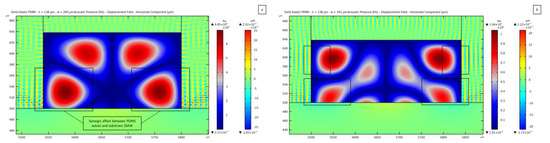 Being the pressure distribution independent of the channel width in the case of a thickness of 50 μm, the results here reported refer to a 138 μm thick channel. The parametric analysis has highlighted a distorted pattern of the pressure field within the microchannel in the range of widths between 237 μm and 273 μm, smaller than the value of . Figure 11a shows the pressure field for a 260 μm wide channel. On the lateral walls, the presence of a horizontal wave is highlighted with black boxes at the interface between the fluid and PDMS. The horizontal displacement amplitude in the PDMS has a value of 2.52 × 10−3 μm, meaning that the ratio between this horizontal wave amplitude and the one of the SSAW is 5.5.