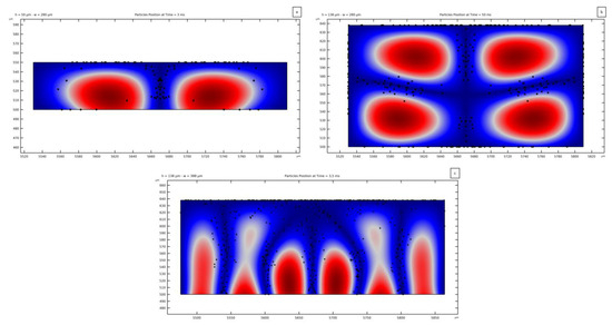 Position of PS microparticles with a diameter of 8 µm, after being displaced by the ARF towards the nodes of the acoustic wave field, in case of PDMS modeled as an absorbing non-flowing fluid. The elapsed time from the release of the particles is (a) 4.5 ms, (b) 50 ms, and (c) 10 ms. These plots are to be compared with those reported in Figure 13.