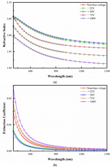 Refractive index (a) and extinction coefficient (b) for HfO2 thin films deposited by DC reactive magnetron sputtering at different negative bias voltages using the Cauchy dispersive model to fit measurement data by spectroscopic ellipsometer in spectral regions ranging between 400 and 1500 nm.