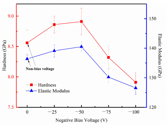 where Dhkl is the grain size, k = 0.89, the X-ray wavelength λ is 1.54 nm, and β is the diffraction peak’s half-height width and the diffraction angle. Based on the value of the line width (FWHM) of the most intense peak, the average crystallite size was estimated. There existed a connection between the line width (FWHM) and () of the monoclinic phase, and the line width (FWHM) was obtained via fitting the diffraction peak to the Lorentzian distribution. As the substrate bias voltage varied from 0 to −25 V or −50 V, the grain size decreased slightly from approximately 84nm to 81nm, which suggested a grain refinement. As the substrate bias voltage was increased to −75 V, the grain size continued to decrease to 79 nm and then dropped to 76 nm as the negative bias voltage increased to −100 V. It can be seen that the grain size tends to decrease as the negative bias voltage increases in the range 0 to −100 V.