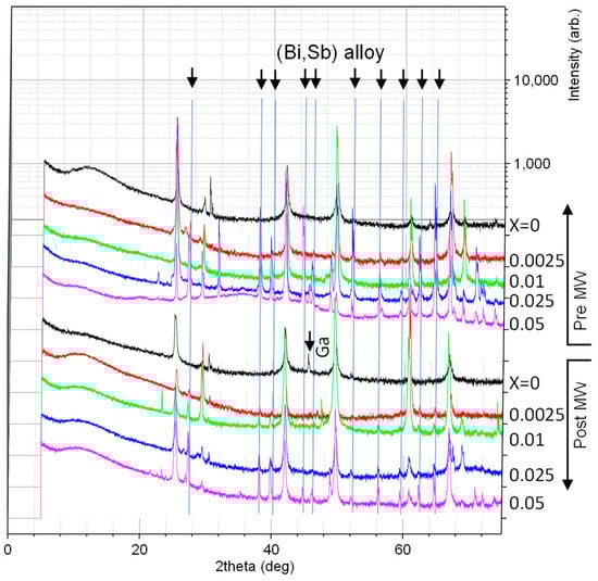 However, this interpretation leaves open the question of the fate of excess Ga in the material. While ambient temperature XRD might struggle to detect small quantities of Ga, particularly if it is in a liquid state, no evidence of liquid Ga was apparent when the samples were sliced for characterization. Interestingly, XRD peaks for Ga metal were observed in the 0% Bi material post microwave treatment, potentially due to field-induced separation, decrystallization, or growth of existing Ga inclusions.