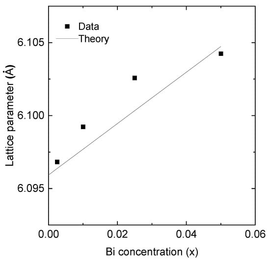 Figure 2 presents the determination of the lattice parameter based on the measured position of the (111) peak. In this figure, the observed curvature in the experimental data points towards a potentially intricate relationship between dopant concentration and the lattice constant. It is worth noting that our theoretical calculations utilized a linear approximation based on Vegard’s Law due to the absence of a system-specific bowing parameter in the existing literature. This discrepancy underscores the necessity for further investigation to derive a more accurate bowing parameter for this material system.