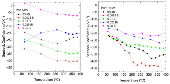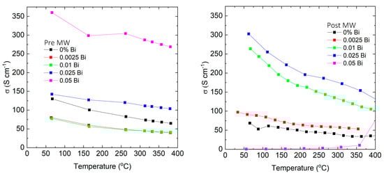 All bismuth additions altered the relationship between the Seebeck coefficient (S) and temperature. Without bismuth, the thermopower displayed a negative temperature dependence above 300 °C, suggesting the occurrence of the bipolar effect due to thermally activated carriers (see Figure 4). This trend vanished in samples with added bismuth, hinting at a decrease in minority carrier concentration within the material across the studied temperature range.