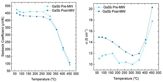 Comparison of Seebeck coefficient and electrical conductivity for a commercially-produced GaSb powder post densification via spark plasma sintering (SPS) and following subsequent microwave treatment.