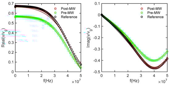 The analysis of both pre- and post-MW samples is detailed in Table 2. The shaded columns are values extracted by fitting the voltage across the reference resistor, while the unshaded columns represent fits obtained once the sample is incorporated into the circuit. It’s worth noting that, in the reference circuit, these elements are absent.