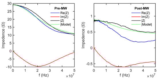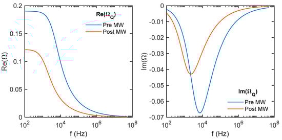 Here, S is the Seebeck coefficient, T is temperature, L is sample length, κ is thermal conductivity, Ae and At are the cross-sectional areas of electrical and thermal conduction, t is thickness, α is the thermal diffusivity of the material, j is , ωc is the characteristic thermal frequency, and ω is the angular frequency of a given measurement. In Figure 9, the ideal impedance resulting from the heat currents (ΩQ) is calculated based on various measured values and the dimensions of the sample. The calculated values, although relatively low, do not exert a significant influence on the pre-MW state. However, they may offer an explanation as to why the simple model failed to accurately represent the post-MW sample, particularly in terms of the reactive part of the impedance. This discrepancy arises because the measured value of the reactive impedance could not be reached in the model, primarily due to the occurrence of the maximum imaginary impedance (Im(Z)max) of R‖C when the current flowing through both elements is equal. Specifically, Im(Z)max is equal to R/2.