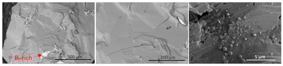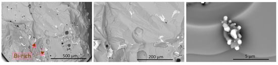 Backscattered electron images of GaSbBi0.0025:Te fracture surface, revealing bright regions indicating the presence of Bi-rich areas due to atomic number contrast from scattering.