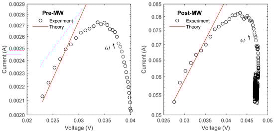 The I-V characteristics were determined by utilizing the measured impedance and the applied voltage across the sample at each frequency during the scan. The variation in the applied voltage is inherent due to the utilization of a fixed amplitude signal in a circuit with frequency-dependent impedance, notably the capacitance and inductance in the analyzer circuit. To obtain a comprehensive understanding, the fitting parameters for both samples are compared in Figure 13, and these parameters were employed to fit the red lines illustrated in Figure 13.