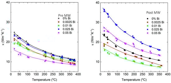 Upon quenching the samples from a melt, a general trend is observed: increasing Bi concentration leads to a decrease in thermal conductivity. However, this trend undergoes a significant change after microwave annealing. For materials with concentrations ranging from 0 to 0.01 B, the thermal conductivity decreases. In contrast, materials with higher Bi concentrations exhibit notable increases in thermal conductivity, as depicted in Figure 14.