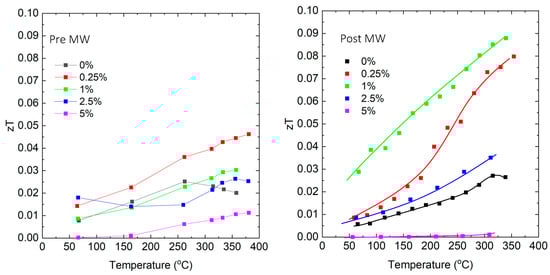 Dimensionless figure of merit (zT) vs. temperature for samples quenched from melt (left) and after microwave annealing (right). Solid lines are guides for the eyes.
