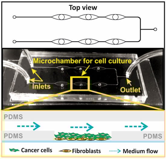 We designed a hybrid, three-layer (PDMS-PDMS-glass) microsystem for the culture of non-malignant and cancer cells in the form of a three-dimensional (3D) cell multilayer. The microsystem consisted of six culture microchambers, allowing several independent analyses to be performed simultaneously. The microchambers in the microsystem were arranged linearly in two rows and connected by a network of microchannels. The microsystem was made of three layers of transparent materials: the first layer of PDMS with a thickness of about 5 mm, equipped with a longitudinal microchamber and channels with a width of 100 µm; the second layer of PDMS with a thickness of 100 µm, equipped with six holes with a diameter of 2 mm of each; and the third layer of sodium glass with dimensions 76 mm × 25 mm × 1 mm. In order to make a thin layer of PDMS, two PMMA plates with dimensions of 100 mm × 100 mm each were used, one of which had a cavity with dimensions of 60 mm × 40 mm and a depth of 100 µm. The cavity between the plates was filled with a mixture of the non-cross-linked PDMS prepolymer with a cross-linking agent (Dow, Sylgard 184) in a weight ratio of 10:1, using a syringe. PDMS was cross-linked at a high temperature (75 °C, 90 min). The plates were then separated to obtain a 100 µm thick polymer membrane. Holes with a diameter of 2 mm each were made in the membrane with a precision Uni-Core punch, in accordance with the geometry of the pattern. All layers of the microsystem were connected using oxygen plasma, which allowed for the creation of a space for cell culture inside the microsystem. The microsystem was used for the culture of human mammary fibroblast and breast cancer cells. To mimic in vivo cancer conditions, mammary fibroblasts were used as the stroma for cancer cells (Figure 1).